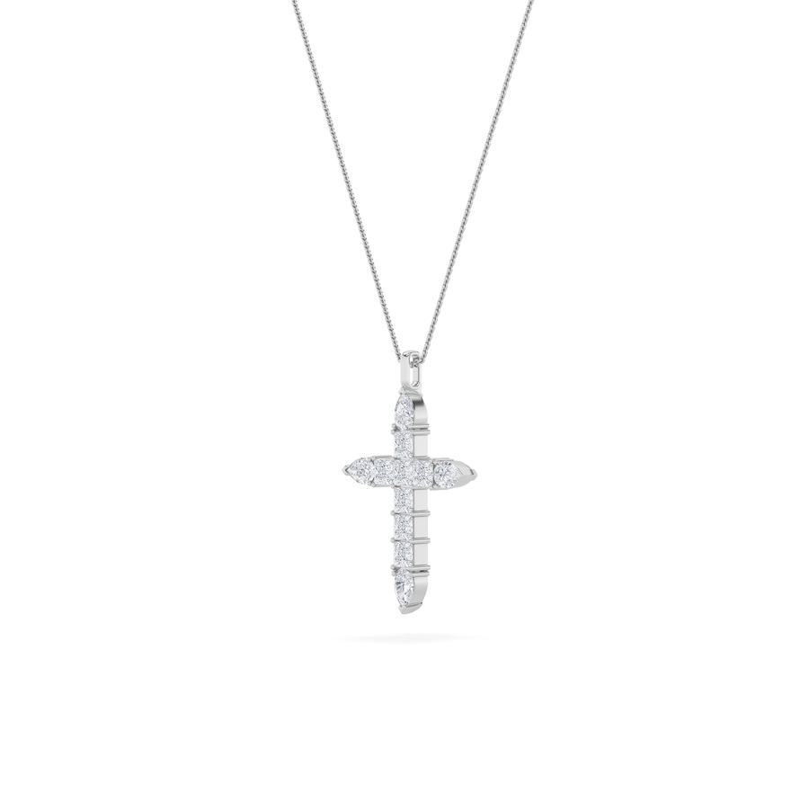 Grace meets brilliance in this stunning 3.5 carat total weight pear-shaped lab-grown diamond cross pendant. Expertly set in luminous 14K white gold, each diamond features F color and VS clarity?delivering exceptional sparkle with a graceful silhouette. The elegant pear shape adds a soft, radiant touch to the timeless cross design, making it a meaningful piece for faith, fashion, or gifting.